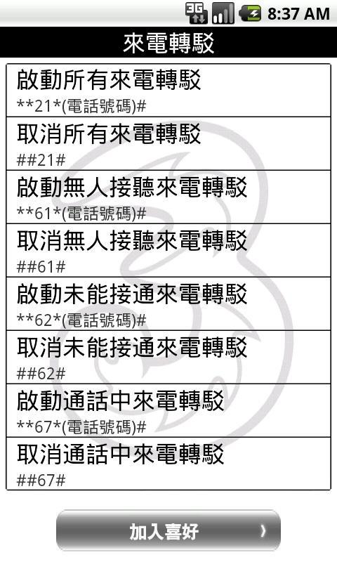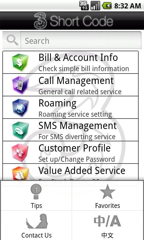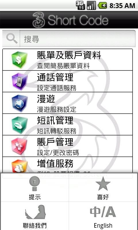 This application helps you to search and utilize all our 3HK short codes, including Call Forwards, SMS Forward, Roaming, Check Bill and much more.