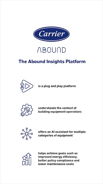 This app is currently available as part of the Abound Predictive Insights SaaS offering and the Abound managed services offerings from Carrier. To know more, visit abound.carrier.com/en/aboundinsights/ or reach out to us at [email protected]. For support and feedback along with the app feedback, you can also write to us at [email protected].