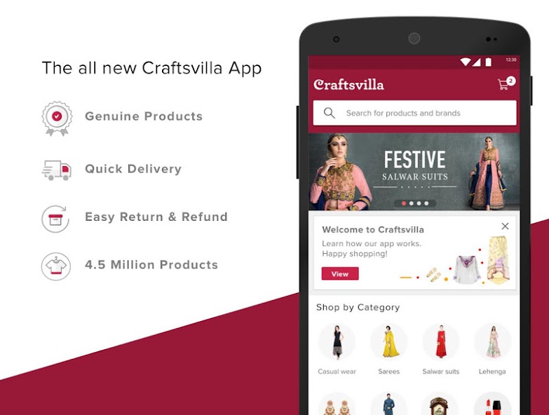 The new Craftsvilla app is user-friendly and offers you Premium Quality Products, Free Shipping, Hassle-free Returns, Easy Order Tracking, 100% Buyer Protection Guarantee and a Convenient Cash-on-Delivery option.
