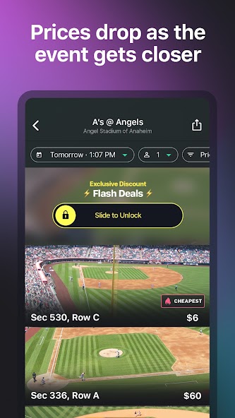 مع Gametime يمكنك العثور على عروض تذاكر الحدث المباشر على الرياضة والحفلات الموسيقية والمهرجانات والكوميديا والعروض بأقل! هل تعلم أن أسعار التذاكر للأحداث المفضلة لديك - الرياضة والحفلات الموسيقية والمسرح - تقترب في الواقع كلما تصل إلى شوتايم؟ احصل على أفضل الصفقات ، وشاهد المنظر من مقاعدك ، واستخدم عملية الخروج البسيطة في Gametime للدخول إلى الأحداث حتى بعد بدءها. يساعد توصيل تذكرة الهاتف المحمول في حفظ الورق والطباعة. يتيح لك مشاركة تذاكر الهاتف المحمول سهلة إرسال تذاكر إلى جميع أصدقائك حتى يتمكنوا من الانضمام إليك في المرح.