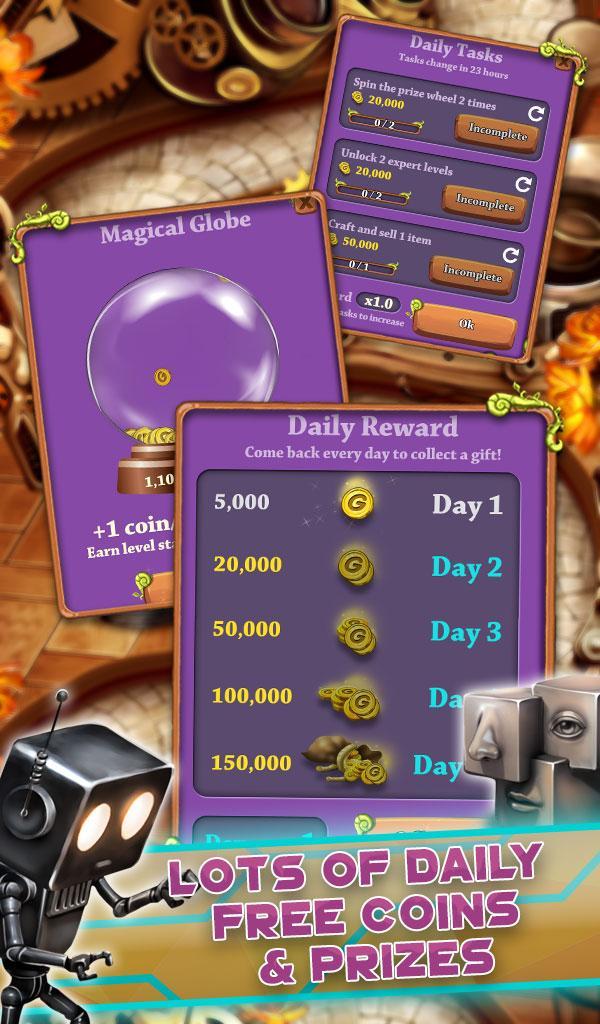 بينما تسير في مغامرتك عبر الزمن ، ستكتشف كنوز نادرة وذات قيمة ميجا. اجمع جميع البلاط الصياغة للكنز وستتمكن من صياغته - الاحتفاظ به أو بيعه ، إنه اختيارك! في نهاية كل مستوى ، سيكون لديك فرصة للفتح بين 1 و 3 صناديق مكافأة مجانية. ماذا يمكن أن تحتوي؟ عملات معدنية؟ زادت الطاقة؟ افتحهم واكتشف!