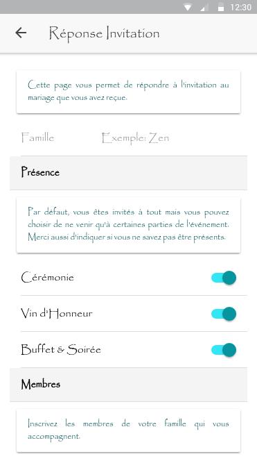 قم بتنزيل "حفل زفافنا" لإدارة ردود الضيوف في حفل زفافك. ما عليك سوى إرسال مفتاح وصول لهم (عبر الإعلان على سبيل المثال) وجمع إجابات حول تفاصيل وصولهم (عدد الأشخاص ووقت الزواج). ميزات أخرى متاحة أيضا.