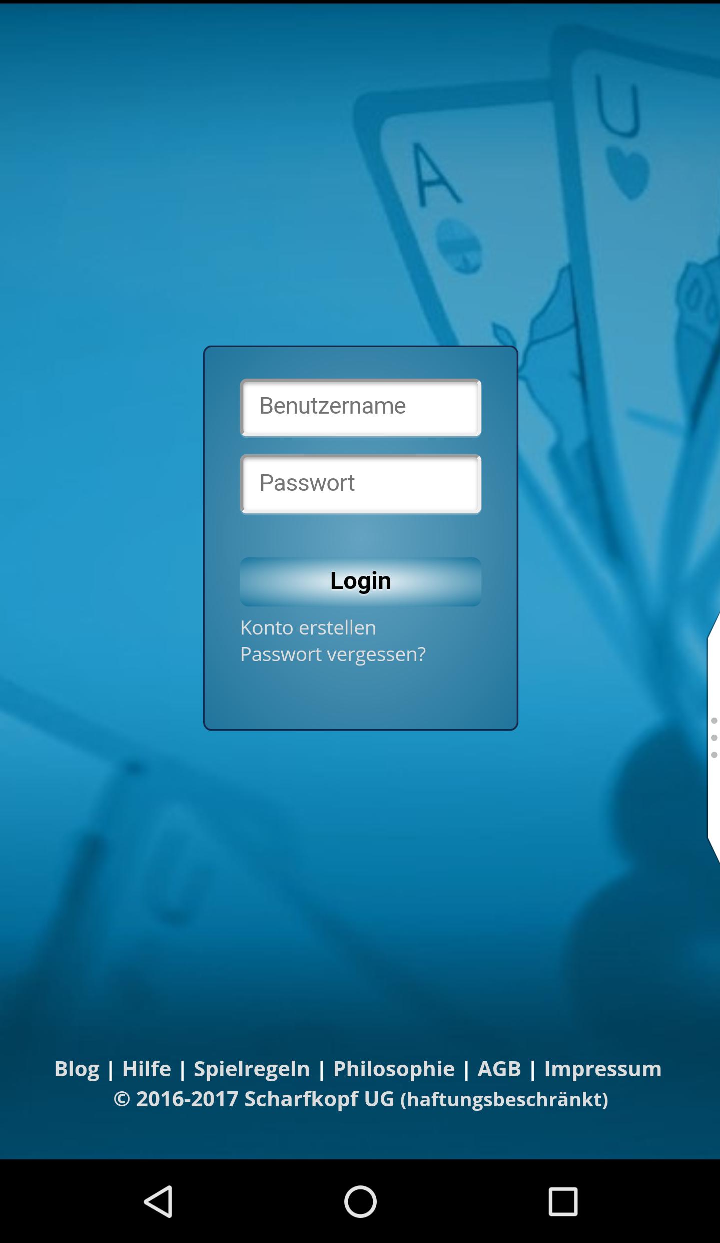 يوفر لك Scharfkopf لعبة البطاقات البافارية "Schafkopf" كتطبيق متعدد اللاعبين. بدلاً من ذلك ، يمكنك أيضًا ممارسة ما يصل إلى 3 أجهزة كمبيوتر في وضع التدريب.