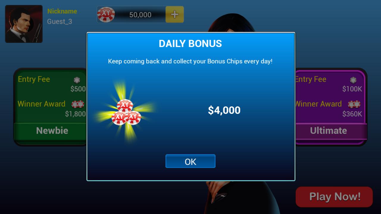 2, Regularly Free Daily Chips, you can come and collect your free bonus chips every day, you aren't required to buy chips in order to play with other players.