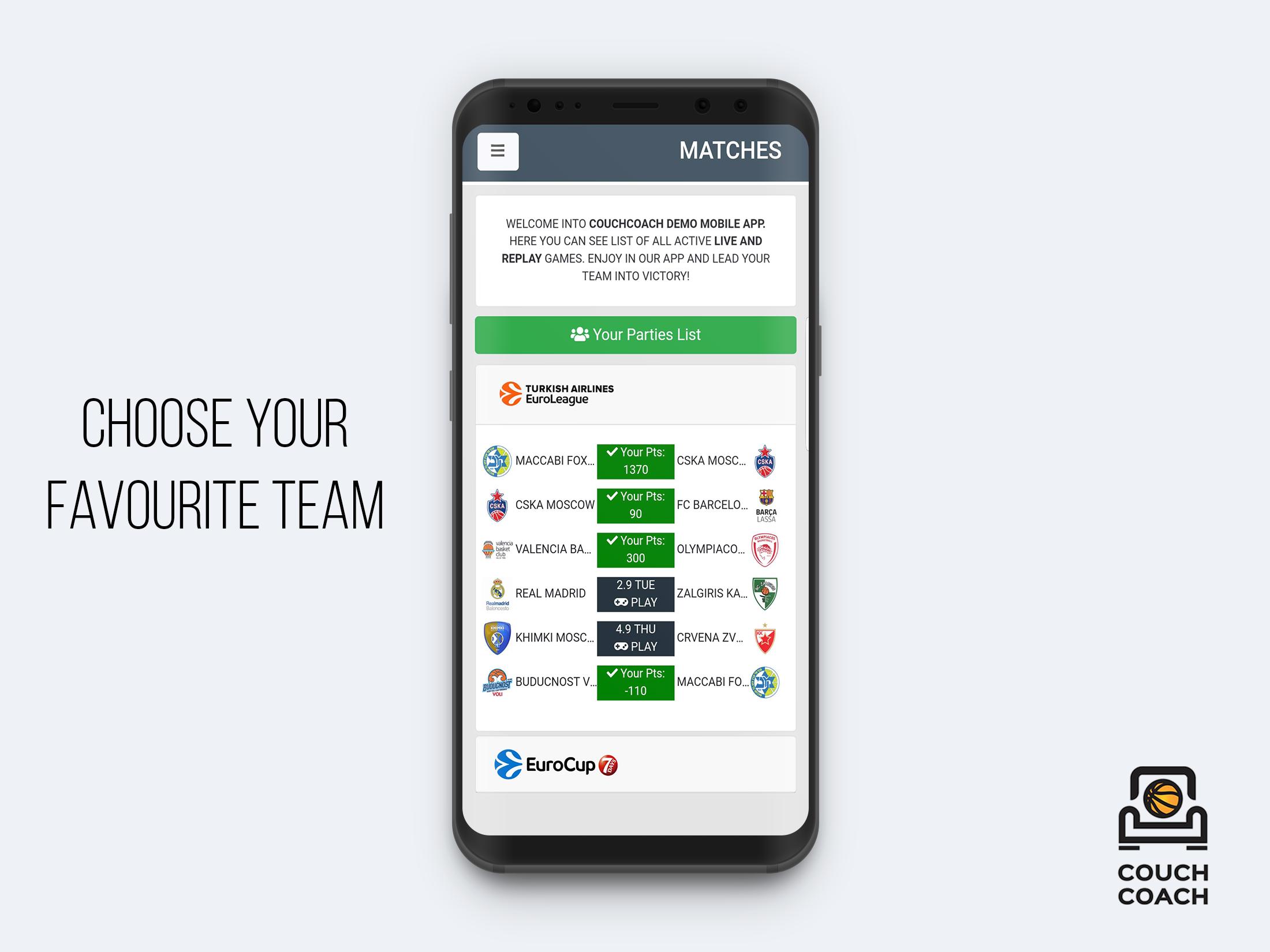 Couch Coach ist eine App, die Sportfans gewidmet ist, die sich aktiv an dem Spiel befassen möchten, das sie beobachten, indem sie vorschlagen, wer in den ersten fünf Jahren spielen soll, wer ersetzt werden sollte, wann ist der richtige Zeitpunkt für die Auszeit und die Besprechung der Entscheidungen des Trainers.