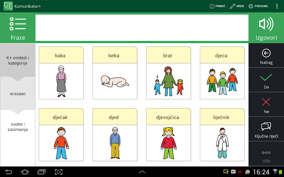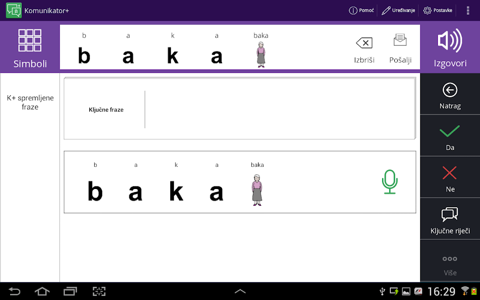 Die Anwendung von ICT-AAC + Communicator ermöglicht das Stapeln von Phrasen und Sätzen mit Symbolen, die integrierte Fotos mit der Gerätekamera, Bilder im Galeriegerät oder Symbole aus den drei nichtkommerziellen Galerien (ARAASAC, MULBERRY und SCLERA) aufgenommen werden können. Mit der intuitiven Benutzeroberfläche findet der Benutzer das gewünschte Symbol und das Klicken auf die Bildaufzeichnung fügt es der Symbolleiste hinzu, die den aktuellen Phrase anzeigen soll.