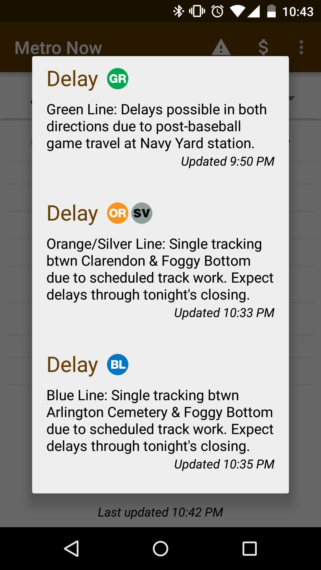Metro Now ist so konzipiert, dass sie so wenige Schritte wie möglich zwischen Ihnen und den Metro -Info, die Sie derzeit benötigen. Melden Sie sich bei der Smart Start -Funktion an, und Metro Now automatisch die nächsten Zugzeiten für den nächsten Bahnhof angezeigt, wenn Sie die App starten. Wenn wir es falsch verstanden haben oder Sie nur an einer weiteren Station interessiert sind, nennen Sie einfach die Linie und die Station und wir erhalten die Informationen, die Sie benötigen. Metro Now automatisch nach Service -Benachrichtigungen und benachrichtigt Sie höflich, wenn Verzögerungen die Station beeinflussen, die Sie sich ansehen. Jedes Mal, wenn der Alarmknopf beleuchtet ist, gibt es einen Alarm. Tippen Sie einfach auf die Schaltfläche, um alle Warnungen zu sehen.