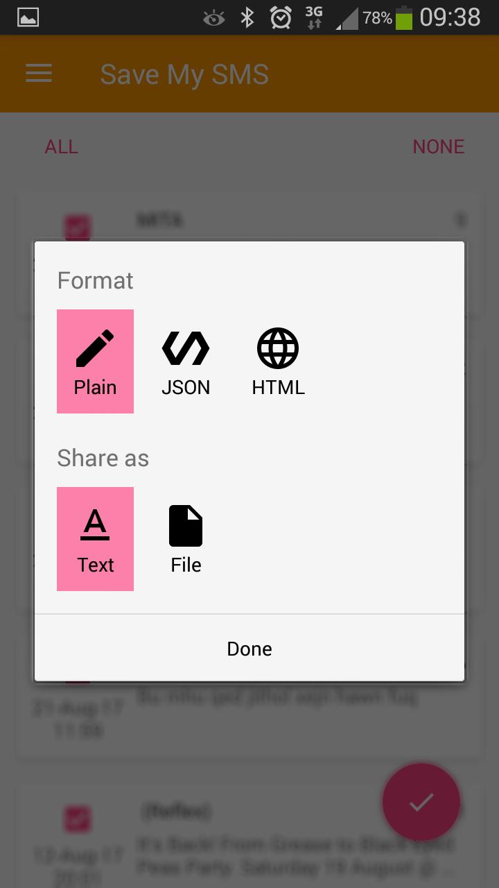 Sobald die Einstellungen durchgeführt sind, können Sie mit dem Exportieren von Textnachrichten beginnen. Bestimmen Sie auf dem Hauptbildschirm, dass alle Threads überprüft werden und wenn nicht, tippen Sie auf der oberen linken Seite des Bildschirms, um alle Threads auszuwählen. Tippen Sie dann auf das Pfeilsymbol im rosa Kreis rechts rechts auf dem Bildschirm. Wählen Sie als nächstes "Text" aus, um Textnachrichten per E -Mail oder "Datei" zu exportieren, um Textnachrichten in einer Datei auf Ihrem Smartphone zu speichern, und klicken Sie auf "Fertig".