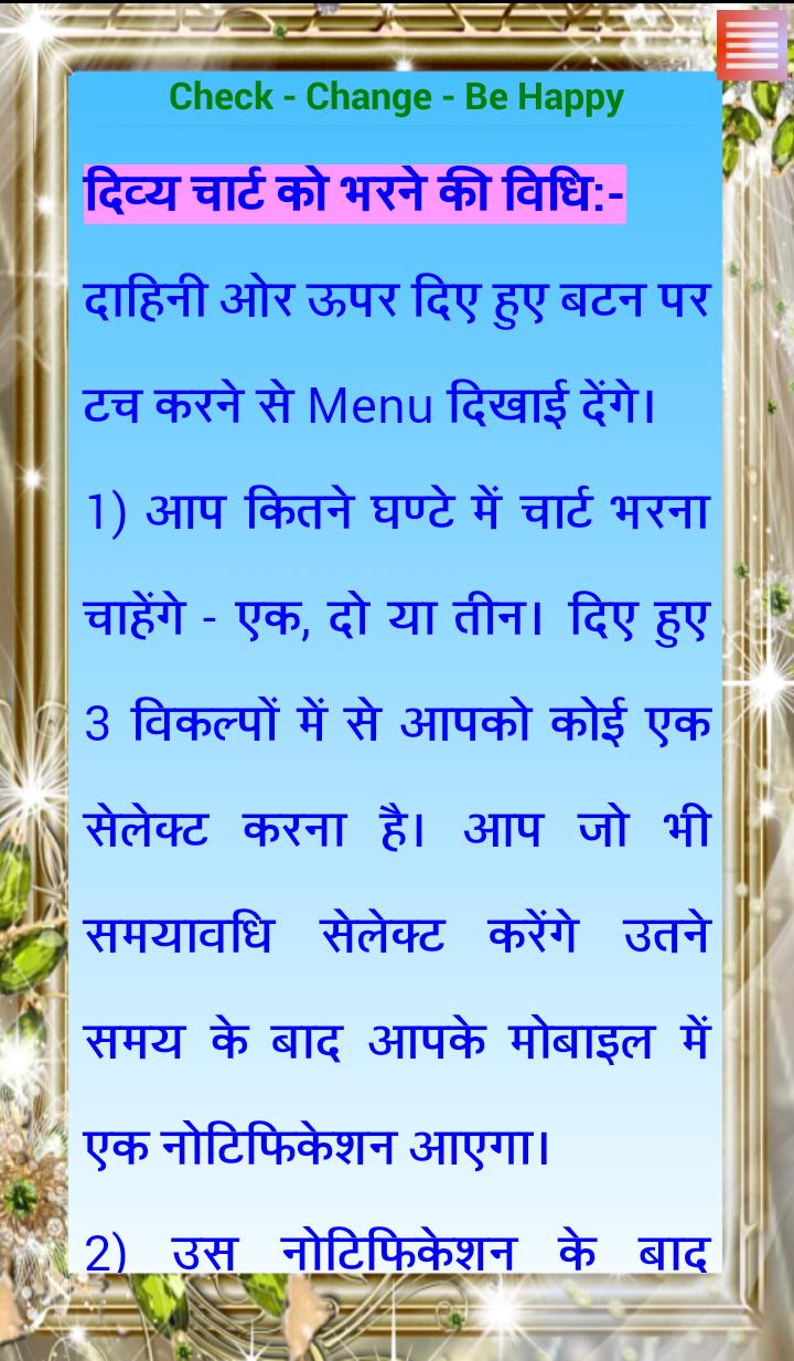 Om shanti. Sakar Brahma Baba and Avyakt BapDada has many times described self-checking of thoughts, words and actions and keeping its chart as most important tool for self-progress and to become free from vices. This App will encourage you to check yourself every hour and motivate you to fill the chart with zeal and enthusiasm.