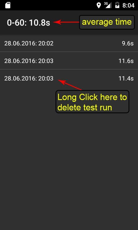 DynoMeter enables you to measure the performance of your vehicle. Top Speed, Elasticity as well as Timing for 1/4 and 1/8 Mile is possible. For more accuracy in the measurement the acceleration of the vehicle will be used to calculate the speed between GPS updates. The results can be viewed within a local database after each testrun individually for every vehicle profile.