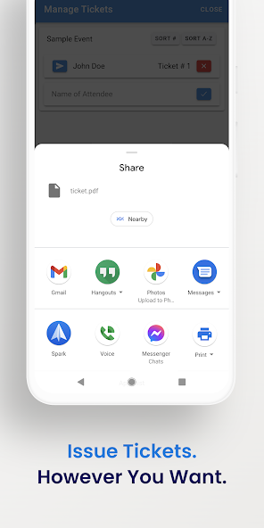 Enviar boletos electrónicamente a los ticketsholders nunca ha sido más fácil. Compártelos por correo electrónico, mensajes de texto o redes sociales. ¡Incluso puede imprimirlos a través de una impresora conectada!