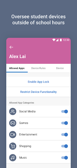 Jamf Parent facilita a los padres para administrar los dispositivos emitidos por la escuela de sus hijos. Usando la interfaz intuitiva, puede restringir qué aplicaciones puede acceder a su hijo en su dispositivo, recibir notificaciones cuando su hijo llega a la escuela y programar el tiempo de tarea o la hora de acostarse utilizando reglas del dispositivo para permitir o restringir ciertas aplicaciones.