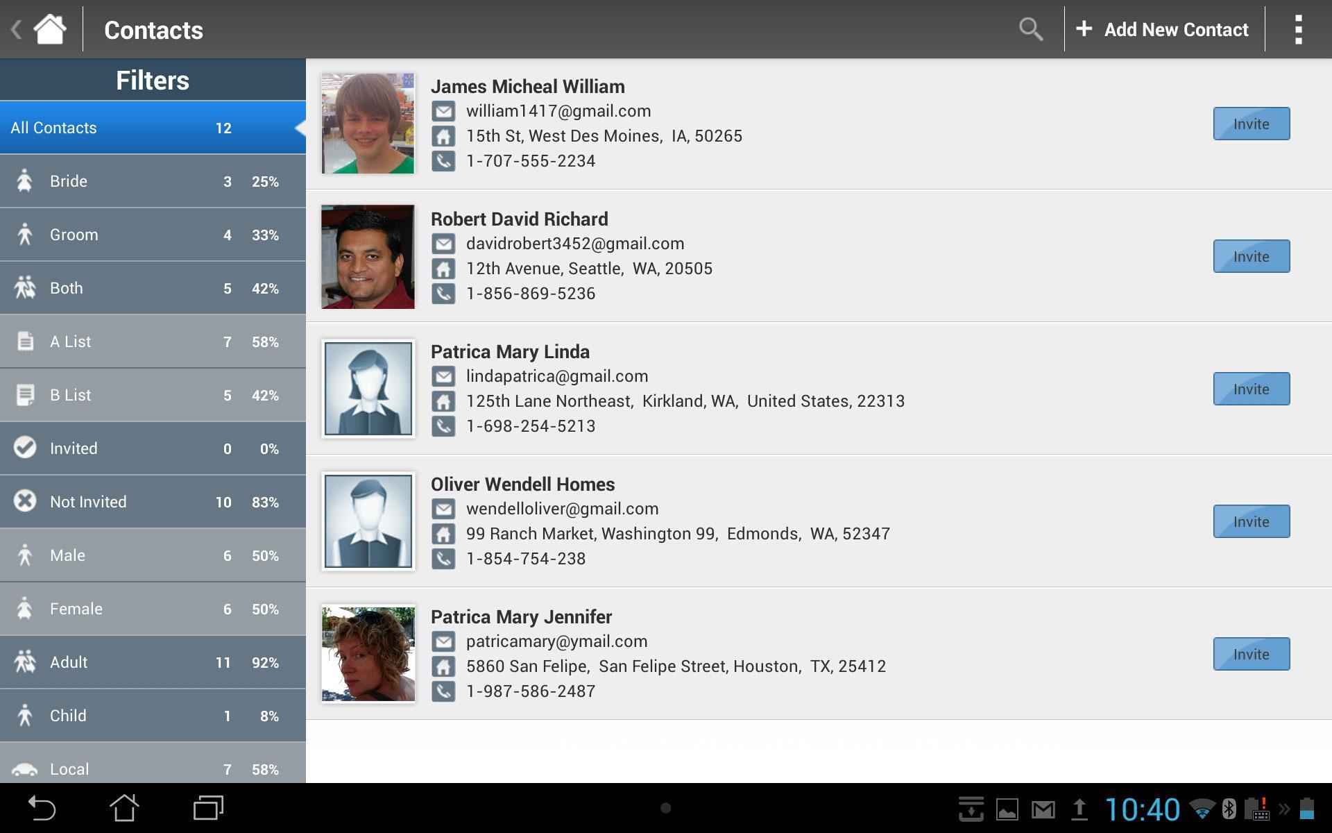 Contactos: cree fácilmente su lista de invitados. Importar rápidamente los contactos o ingresarlos manualmente. Administre la información de la dirección y elija qué contactos invitar a su gran día. (Hasta 10 contactos en la versión de prueba gratuita, contactos ilimitados en la versión completa).