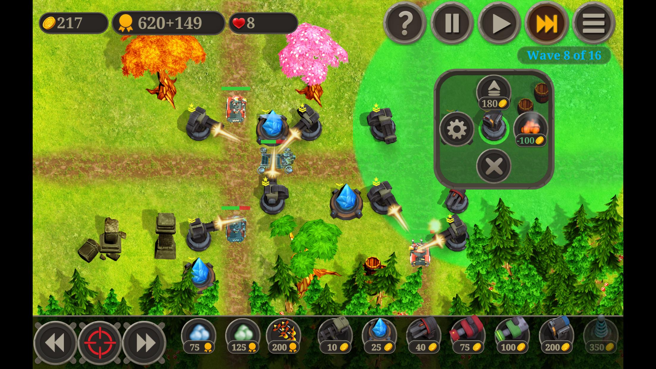 Construye torres para detener a los enemigos. Cada torre tiene un efecto diferente. Por ejemplo, la "ametralladora" tiene poco efecto en los tanques pero muy efectivo en otros enemigos. Verifique la pantalla de ayuda del juego para obtener más información.