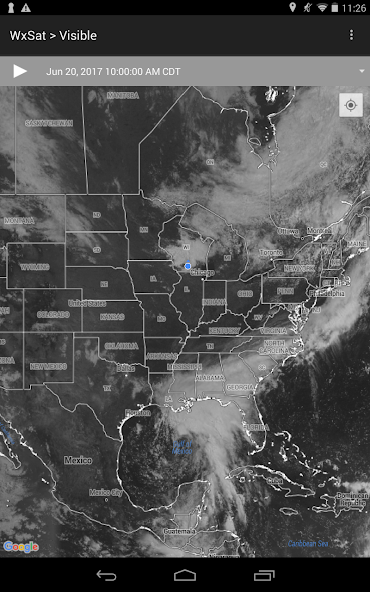 WxSat (abreviatura de satélite meteorológico) muestra y anima datos satelitales meteorológicos de resolución completa en tiempo real. WxSat aprovecha las tenencias del centro de datos SSEC para proporcionar cobertura global para canales visibles, infrarrojos y de vapor de agua.
