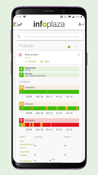 Avec Bouwweer de Bouwend Nederland, vous pouvez montrer l'influence de la météo sur tous vos projets. En créant un projet pour votre chantier de construction, vous pouvez voir en un coup d'œil si vous pouvez effectuer votre travail dans la semaine à venir ou non. Très simple en raison des couleurs vert, orange et rouge. Pour l'asphalation, verser du béton, la peinture, le travail à des hauteurs ou l'activité que vous avez prévue. Vous pouvez facilement le définir vous-même. De cette façon, vous avez un aperçu clair de chaque projet pour savoir si vous pouvez travailler. Par meilleure planification, vous réduisez également vos coûts opérationnels.
