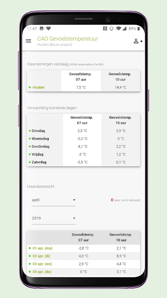 Naturellement, Bouwweer vous donne également un aperçu de la perte météorologique selon diverses normes de l'accord de travail collectif. Nous travaillons en étroite collaboration avec Technisch Bureau Bouwnijverheid (TBB est le secrétariat des parties à l'accord de travail collectif dans l'industrie de la construction). Et vous utilisez Bouwweer dans les litiges. Par exemple pour calculer le nombre de jours (non) réalisables dans un projet. Sur la base de UAV, GIW ou de vos propres critères, vous pouvez rapidement créer un aperçu historique avec des jours impraticables pour votre projet.