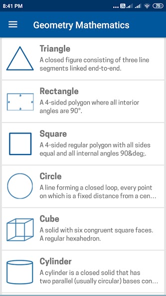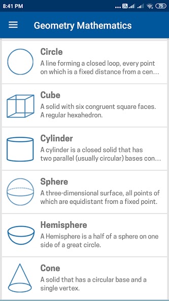 Cette application de géométrie nous donne une idée claire des concepts de la géométrie euclidienne. Traite tout sur les chiffres géométriques, les expressions et autres paramètres significatifs. Cette application aide les étudiants de toutes normes à tout savoir sur le triangle, le rectangle, le carré, le cube, le cercle, la sphère, l'hémisphère et le cône. Un autre avantage important à propos de cette application est que cela traite clairement des formules pour trouver les différents paramètres géométriques comme le périmètre, la zone, le volume et d'autres mesures importantes de toutes les figures géométriques. Nous espérons que cette application de géométrie est une très excellente référence de poche pour tous les apprenants géométriques.