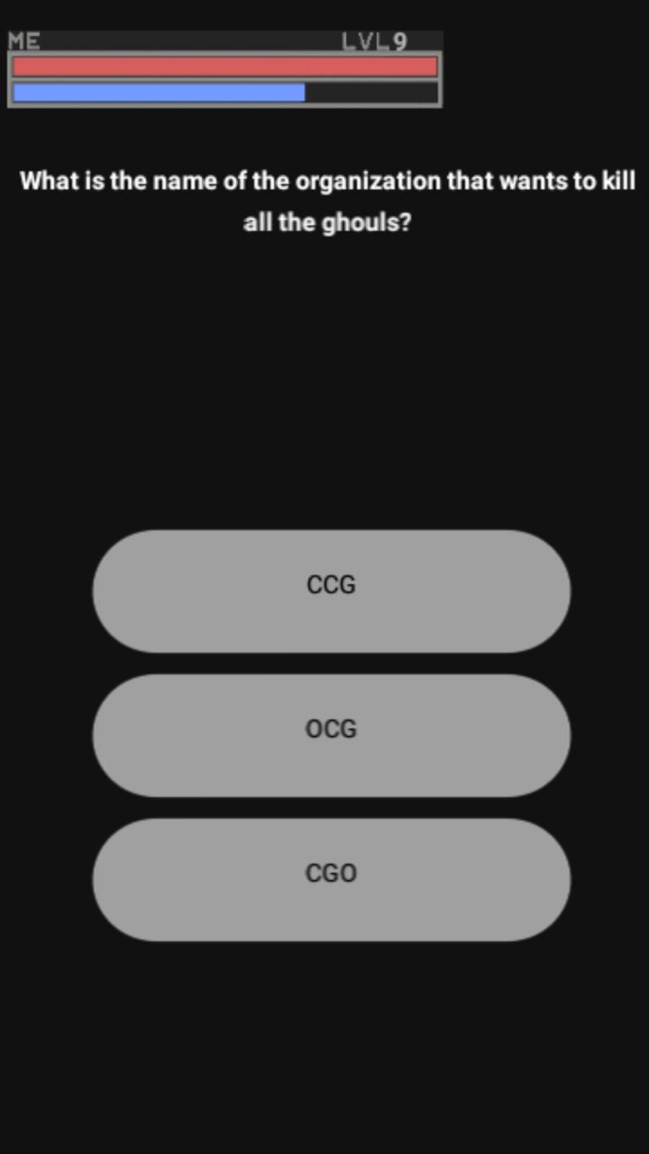 Ce quiz concerne un anime où un gars appelé Kaneki devient une goule et essaie de survivre avec d'autres goules mangeant de la chair humaine, mais différents, il n'aime pas la chair humaine et essaie d'être un humain et une goule en même temps.