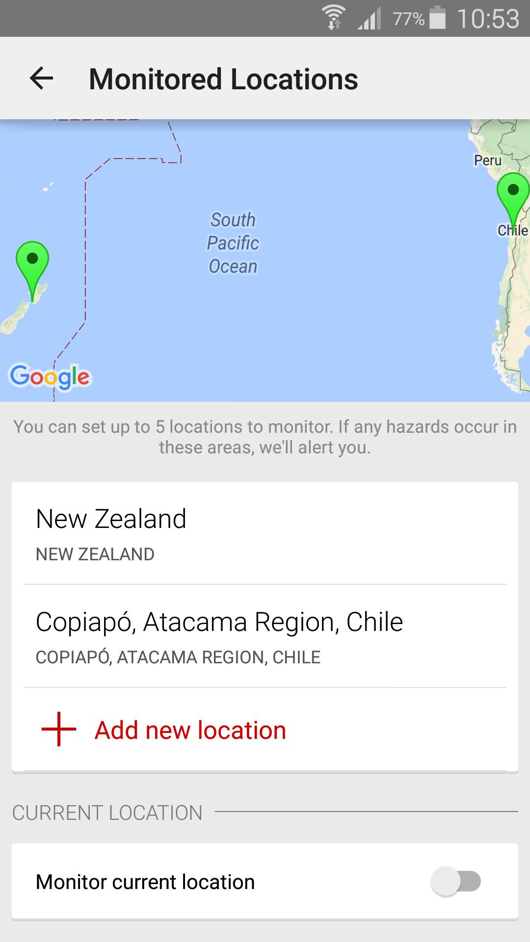 Vous recevrez des notifications de tremblements de terre et des montres / avertissements des intempéries et des orages, pour n'importe où en Nouvelle-Zélande.
