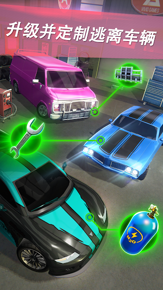 Le plus recherché mérite les manèges les plus chauds. Choisissez et personnalisez les voitures à partir de 10 modèles différents, y compris des voitures de sport rapides et des camions puissants. Au fur et à mesure que vous nivelez et collectez de l'argent, déverrouillez les looks personnalisés pour personnaliser votre voiture et conduire le trajet le plus chaud sur la route! Utilisez votre argent pour débloquer des boosts et des power-ups comme Nitro pour échapper à n'importe quelle poursuite de voiture de police, ou des clés pour réparer votre voiture de course en déplacement.