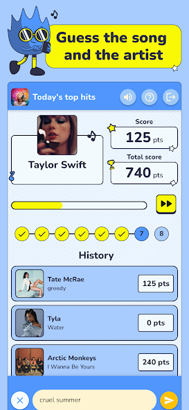 Choisissez une playlist, devinez la chanson et l'artiste le plus rapidement possible pour gagner plus de points!