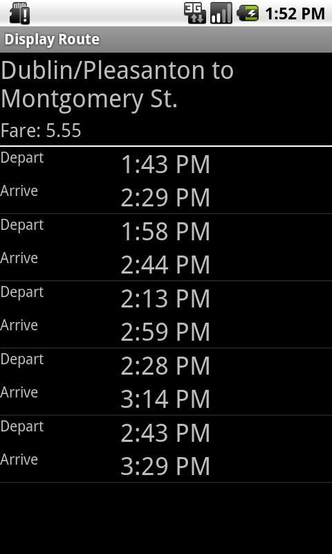 Quick BART a été conçu pour les cavaliers fréquents de BART (Bay Area Rapid Transit). Il affiche le temps des trains dès maintenant pour vos itinéraires préférés. Il y a aussi un planificateur et une carte.