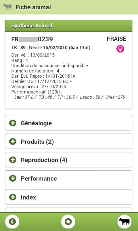 - Retrouvez rapidement et simplement toutes les informations d’un animal : généalogie, les dernières IA, les résultats de CL, les traitements sanitaires...
