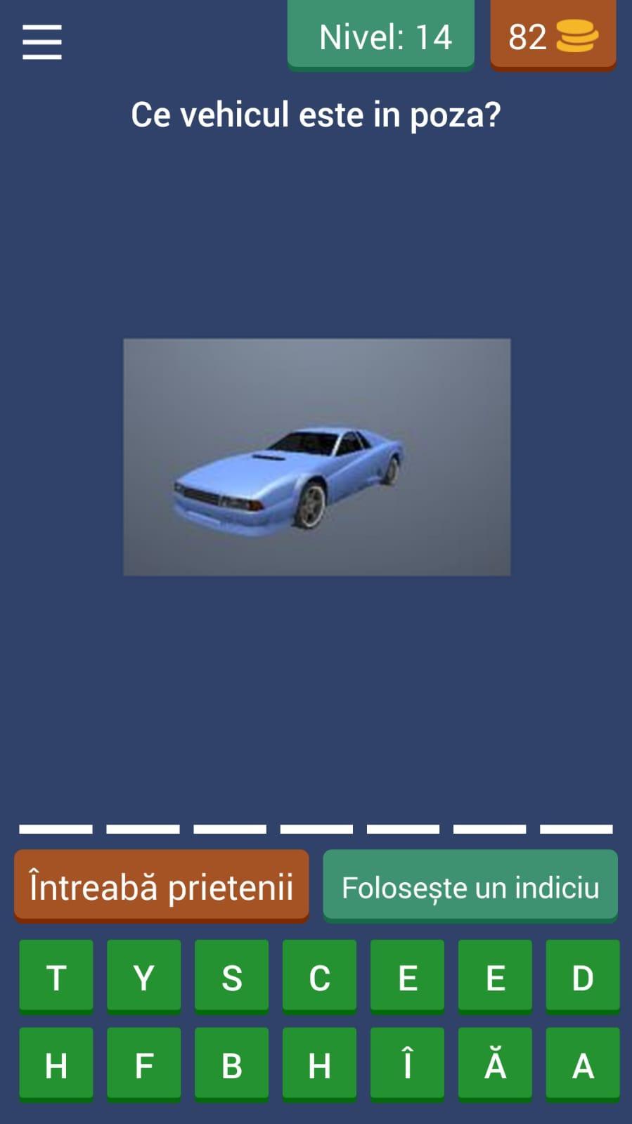 Our game " Ghiceste Masina Din SAMP " is a trivia game that contains a lot of questions about the cars in "Grand Theft Auto San Andreas Multiplayer". Try to answer all the questions correctly and finish the game! Success!