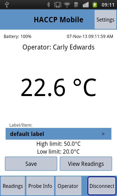 HACCP Mobile from ETI Ltd is designed to allow Android phones and tablets to be used in conjunction with the ETI Ltd BlueTherm Probe, as a thermometer. In seconds you can turn your Android Device into a professional HACCP solution. Create custom lists for users and food items with free Windows® accessory software, then email them to your mobile device. Assign high and low temperature settings for each food item. Store temperature readings with the touch of a button and add user notes and corrective actions where needed. Email the results to your inbox to store electronically as a CSV file.