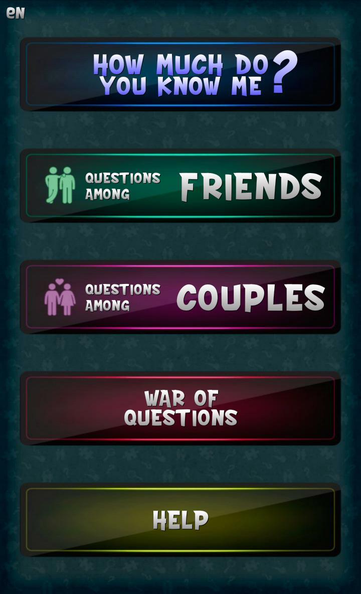 This game calculates how much you and your friend or couple know each other after answering a series of questions. First you have to answer personal questions that will be different depending on who you're playing with. Then you must let the other person with whom you play answer the same questions, trying to get their answers match yours. At the end of the game you will get a total score set by the number of coincidences in your responses. Also, the application will give another score about the relationship between the two of you.