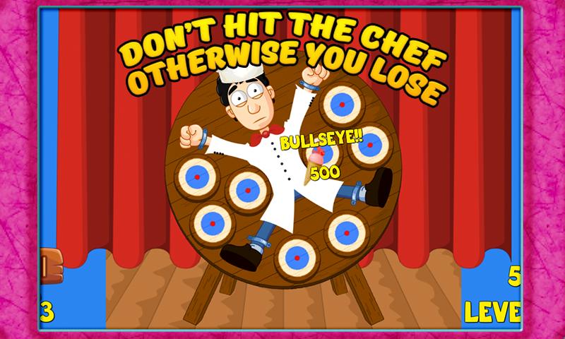 Chef is tied up on dart wheel, smash & hit the targets with ice cream