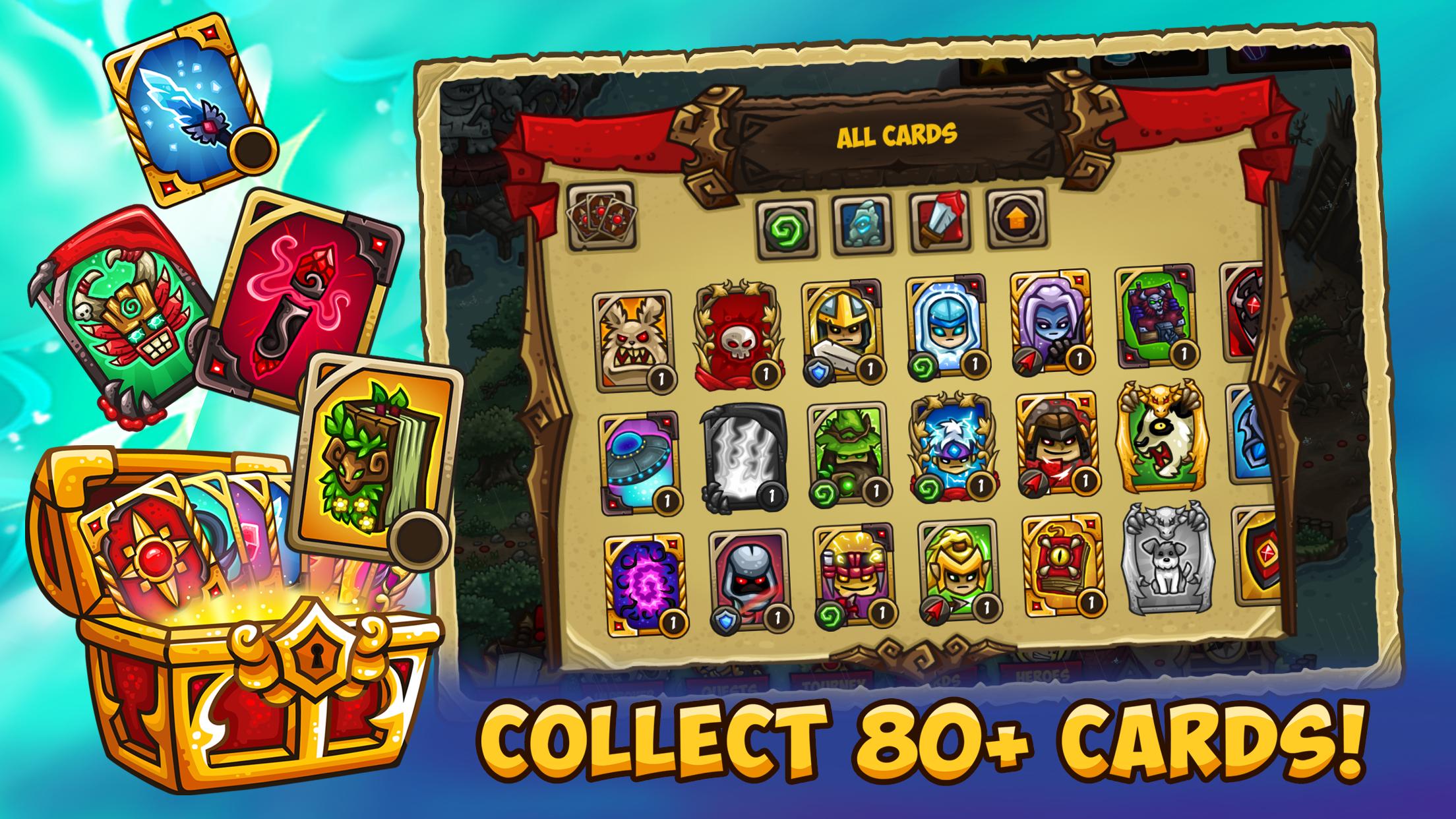 • Kartu CCG! Lebih dari 80 kartu CCG yang unik untuk dikumpulkan (senjata, peningkatan untuk menara, sihir, raja, hewan peliharaan)