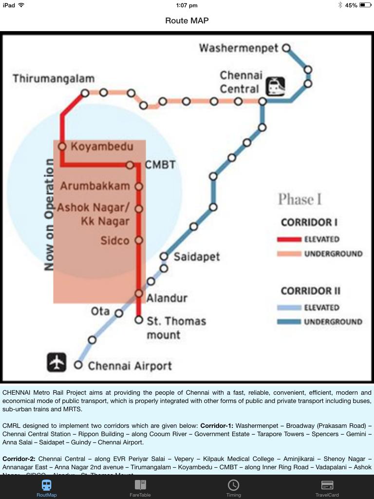 Aplikasi ini memiliki info tingkat pertama tentang jalur kereta Metro Chennai.