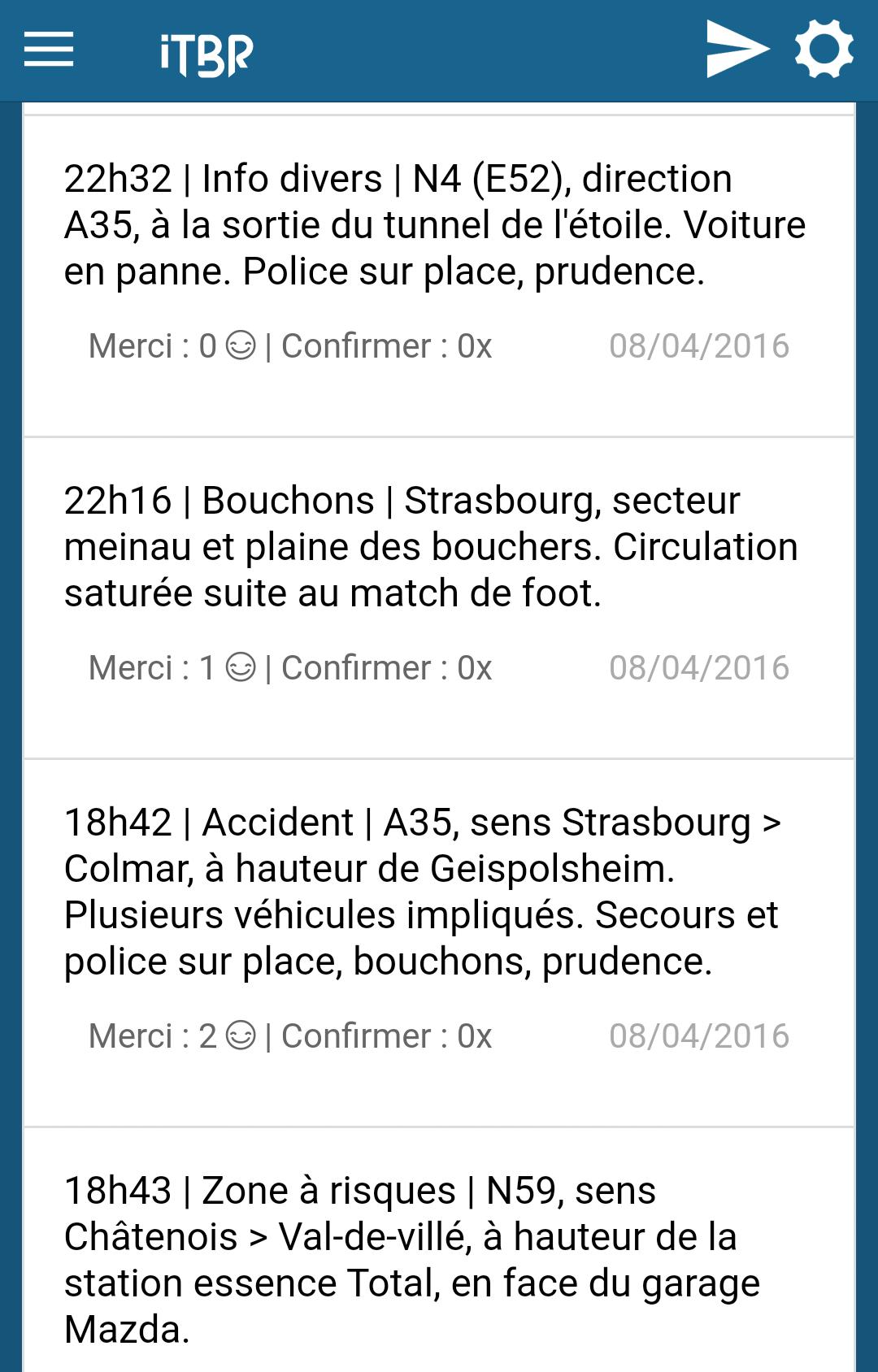 Aplikasi komunitas info lalu lintas dari BAS-RHIN 67 memungkinkan pengguna untuk diperingatkan tentang area risiko, kecelakaan, kemacetan lalu lintas, cuaca buruk, semua jalan raya dan berbagai berita di departemen, sebelum mengemudi.