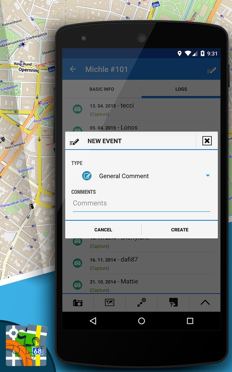 - Menampilkan Detail Munzee - Koordinat, Jumlah Penangkapan, Tanggal Penyebaran, Pencipta, Catatan, Petunjuk, Komentar