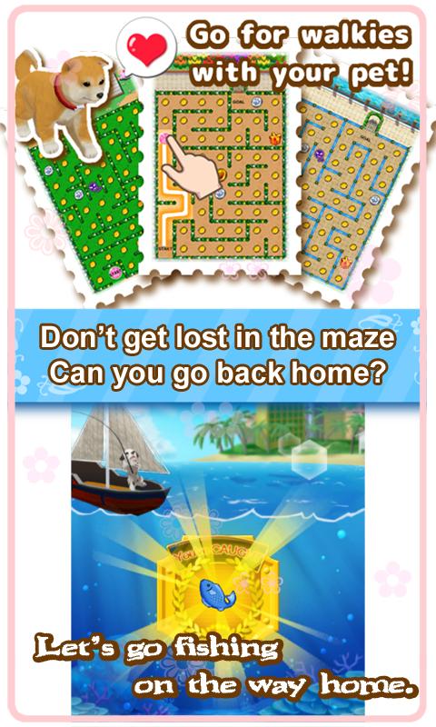 Pergi berjalan kaki dengan hewan peliharaan Anda dan ambil emas dan barang. Anda dapat menggunakan emas untuk membeli makanan, obat -obatan, mainan, dan barang -barang kamar mandi. Anda juga dapat pergi ke game arcade di mana ada banyak permainan untuk dimainkan, bertujuan untuk skor tinggi dan mendapatkan emas untuk mengalahkan skor tinggi Anda sendiri.