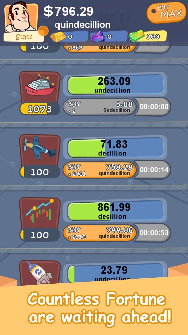 Mulai dari tidak ada orang seperti pengemis bahkan tanpa telur atau kue untuk makanan, Anda harus mengetuk pohon uang dengan upaya besar dan taktik untuk membuatnya berkembang sampai hari kiamat! Menghasilkan uang hujan, membuat bisnis menjadi viral! Setiap langkah kecil adalah kunci untuk menjadi taipan yang dapat memiliki pakaian, Inc, Cookie, Inc, Estate, Inc, Train, Inc dan dll.