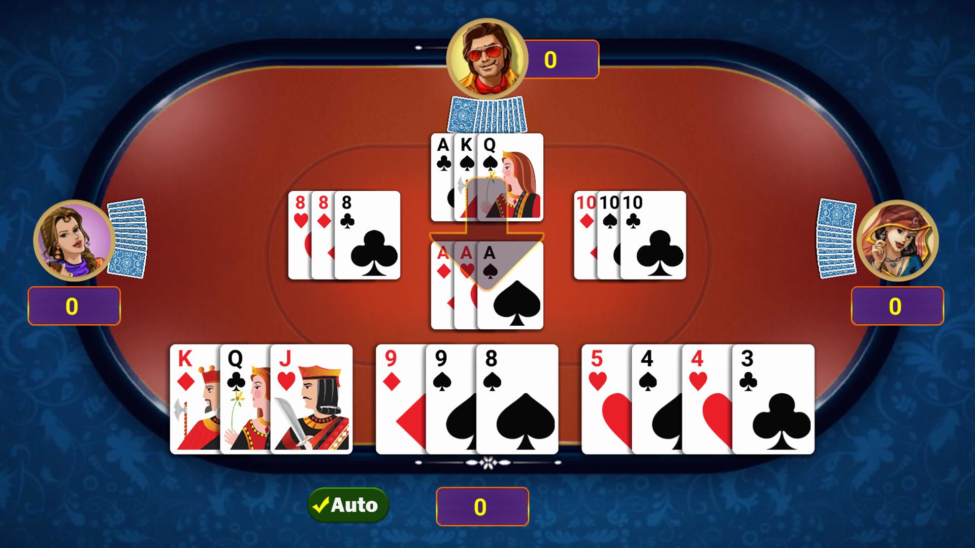 すべてのプレイヤーは、最初に最高の組み合わせをプレイする必要があります。最高の手を持つ人が手を獲得します。手を獲得した人は誰でも、12枚のカードのすべてのポイントを集めます。 A、K、Q、J、10はそれぞれ10ポイント、2〜9枚のカードにはそれぞれ5ポイントがあります。同じように、2番目とサードハンドが再生されます。 4回目の最終ラウンドでは、3カードグループの中で最も弱いものと予備のカードで構成される最後の4枚のカードをプレイします。この最終ラウンドの勝者は、16枚すべてのカードを撮影します。