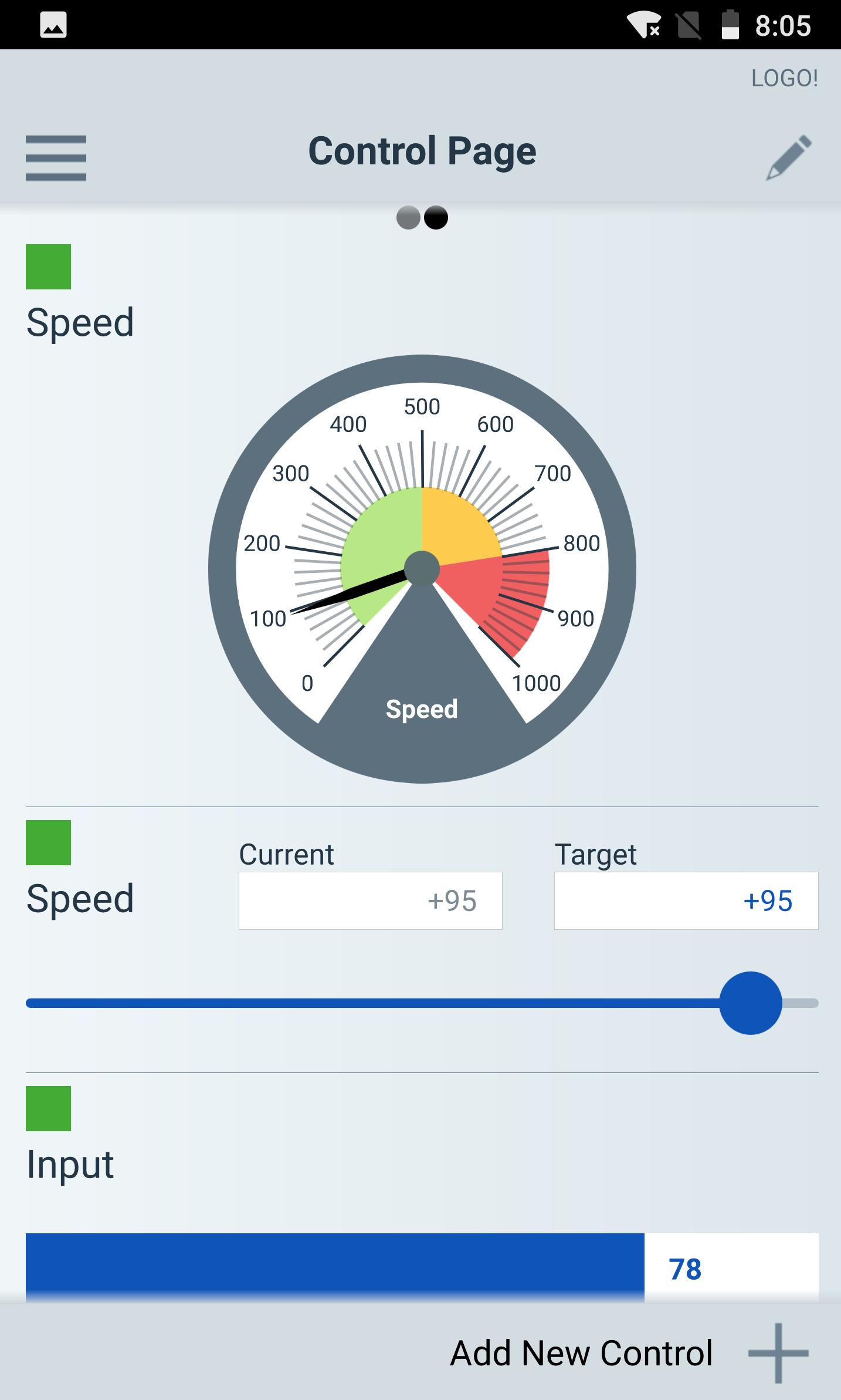 •プロジェクト可能なコントロールタイプのセットで変数を操作および監視するように制御ページを構成します:ゲージ、ボタン、スライダー、棒グラフ、出力フィールド。各コントロールタイプのうち、1つのコントロールを無料で構成できます。 1つのコントロールタイプのより多くのコントロールが必要な場合、それぞれの制御タイプは、アプリ内で1回購入してロック解除する必要があります。ロックを解除した後、それぞれのタイプの多くのコントロールを目的で構成できます。ただし、コントロールの最大数は50に制限されています。