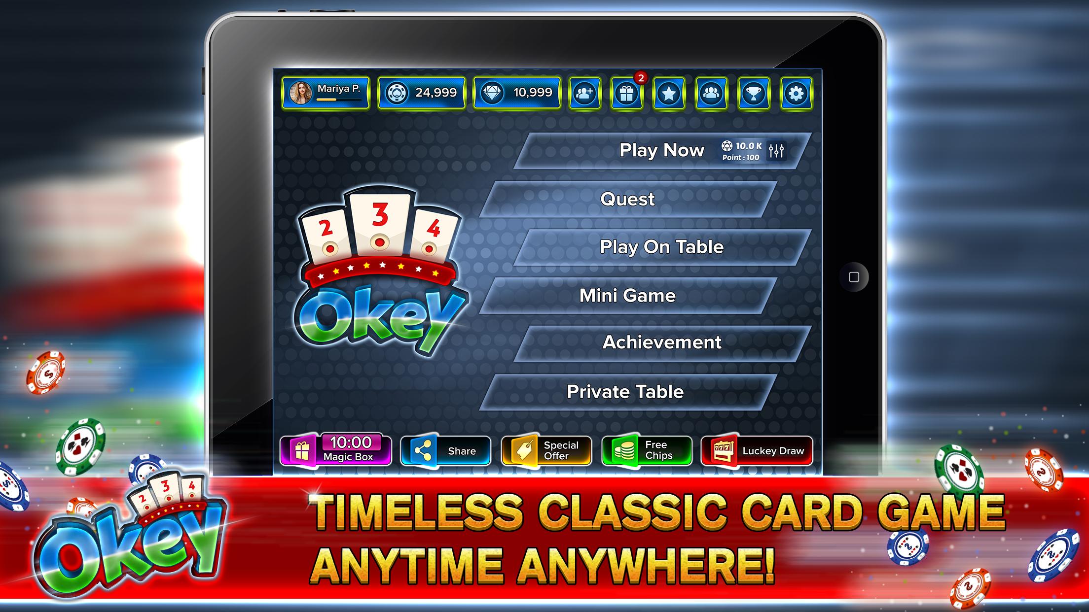 Okey Multiplayerゲームは、106タイルのセットを持つ4人のプレイヤーがプレイし、そのうち104人は4つの異なる色で1〜13に番号が付けられています。ゲーム中、各プレイヤーはボード上に14個のタイルを持っています。それぞれのターンで、プレーヤーは1つのタイルを描き、1つのタイルを破棄します。ゲームのオブジェクトは、最初に14タイルすべてを使用してセットと実行を構成するボードを形成することです。すべてのゲームに選ばれた特別なタイルがあります。これは、欠落しているタイルを交換することで、プレイヤーが14タイルのボードとランニングのボードを形成するのに役立つジョーカーと呼ばれます。ブラックラウンドで表された106タイルセットの2つの最後のタイルは、トリッキーな「偽のジョーカー」であり、期待に反して通常の番号のタイルとして機能します。