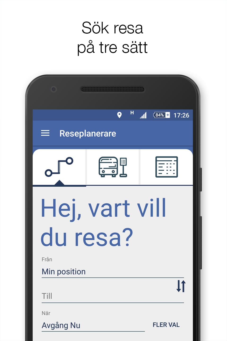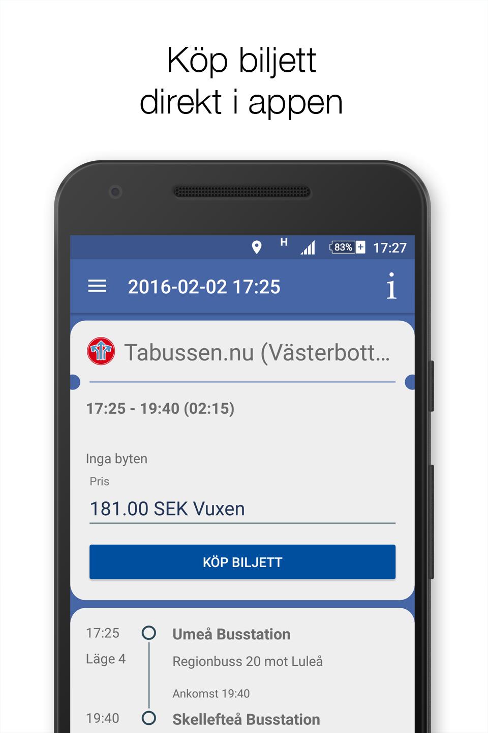 länstrafikenvästerbottenは、Västerbottenを旅行するときに交通情報も提供します。別の郡での関数旅行を使用すると、スウェーデンの大部分で旅行を検索して購入できます。スウェーデンの83%のアプリです。