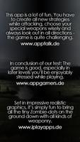 Zombie Blitzでは、空軍全体を支配しています。シンプルなタッチジェスチャーを使用して、爆弾の滴、空爆、ヘリコプター攻撃を開始するか、鉱山と餌を配置します。 11の異なる武器をロック解除して、このアクション主導のタワーディフェンスゲームでベースを守ることができます。たとえば、衝撃範囲を増やすことで、武器を好みにアップグレードしたり、赤外線ビジョンを使用してチャンスを改善したりします。 60以上の場所がゾンビから解放されるのを待っています。さらに、南極の暗闇の無限の大群と戦う世界的なハイスコアを得ることを目指しています。