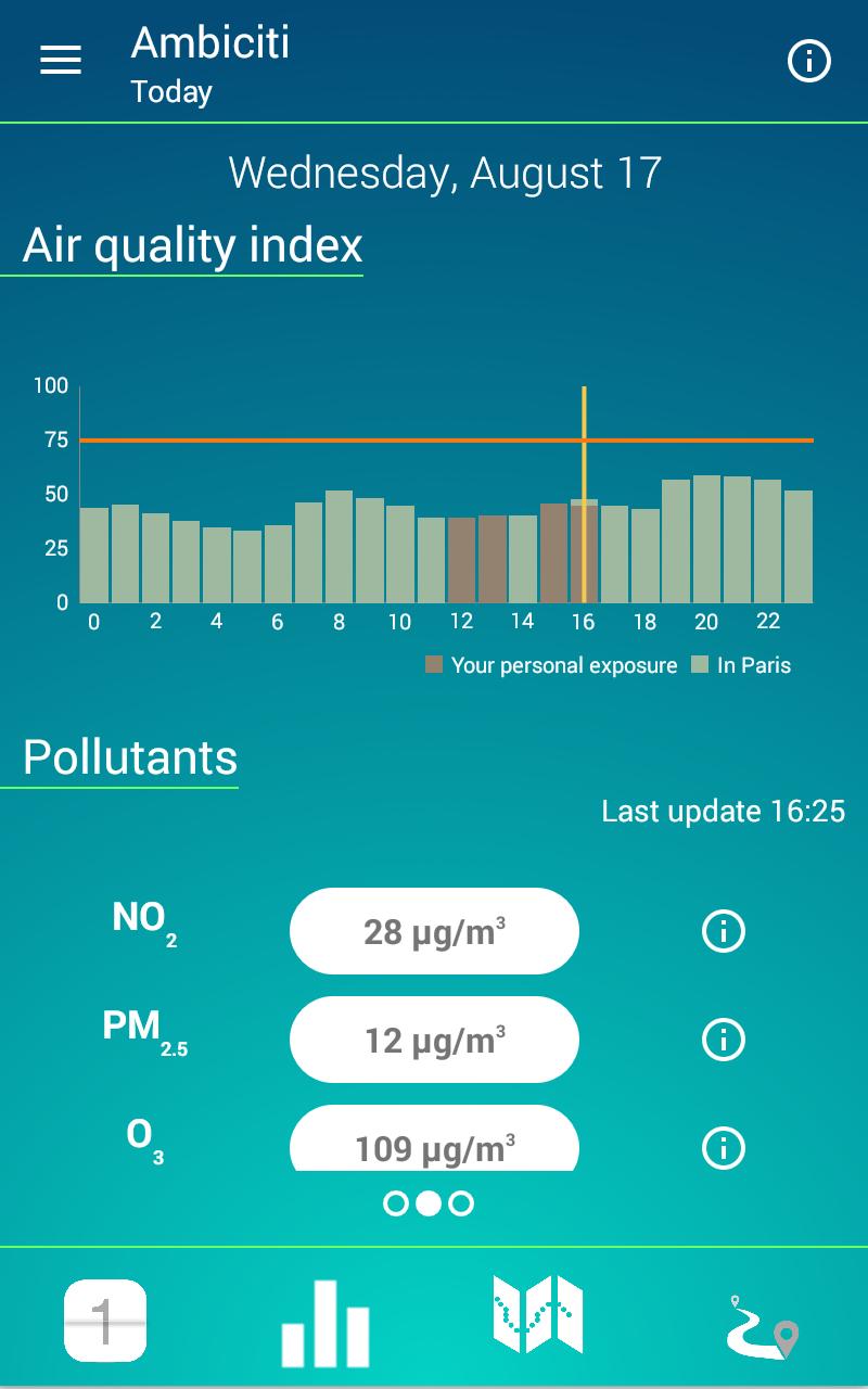 Ambiciti 해당 지역이나 귀하가 서있는 정확한 위치에서 대기 질 지수를 계산합니다. 또한 예측에 액세스하고 주요 오염 물질에 대한 정보를 찾을 수 있습니다. 위치에 따라 시간당 대기 질지도, 거리 해상도, 실시간 및 다음 이틀 동안 액세스 할 수 있습니다. 현재 파리 (프랑스)만이 그러한 훌륭한지도를 즐기지 만 다른 도시가 포함될 예정입니다.