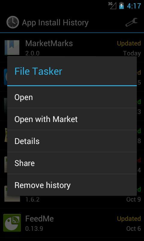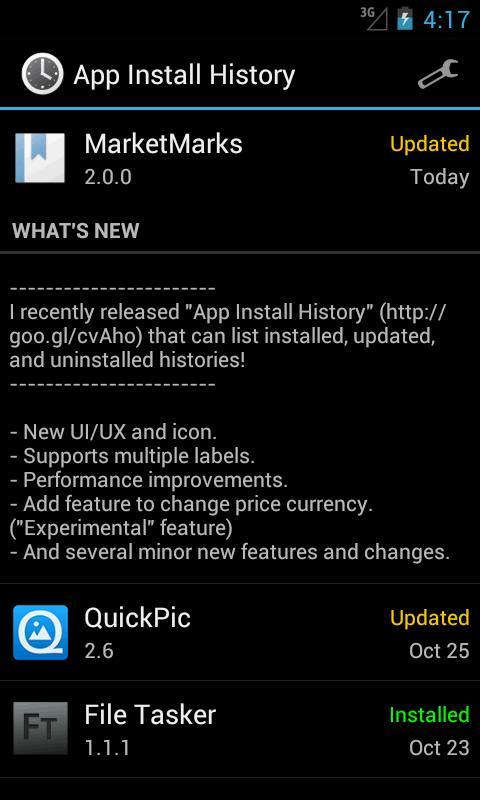 App Install Tracker 레코드 버전, 날짜 및 업데이트 정보 설치, 업데이트 및 앱이 제거되었습니다. App Install Tracker 최대 2,000 개의 레코드를 저장할 수 있습니다.