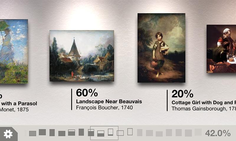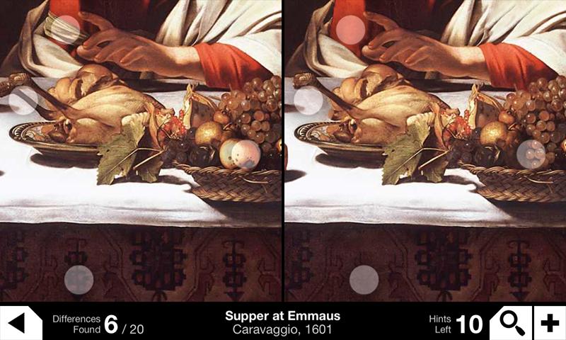이 인터페이스는 사용하기 쉽고 고전적인 그림의 고화질 이미지를 탐색 할 수 있습니다 : 줌으로 축소하고, 이미지를 팬로 끌고, 탭하여 차이점을 표시하십시오.