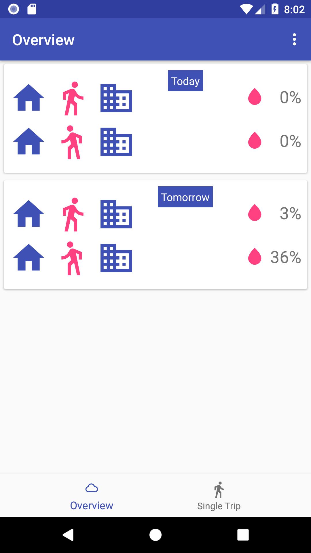 사람들이 도보로 일하거나 자전거를 타는 사람들을위한 개인 날씨 앱은 비가 출퇴근길에 붙잡을 때 사용자에게 경고합니다.
