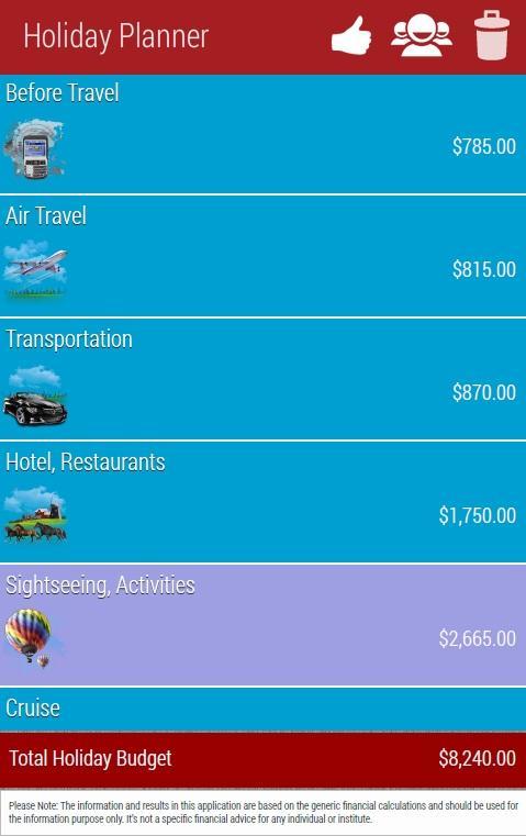 Holiday Budget Planner는 맞춤형 예산으로 휴일을 관리하는 가벼운 도구입니다. 그것은 당신이 일반적으로 휴가에서 발생하는 일련의 사건으로 여행 전 및 사후 여행을 계획 할 수있게합니다.