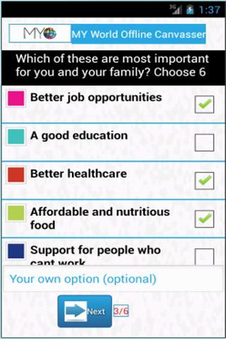 창의적인 온라인 및 오프라인 방법을 통해 내 세계는 개인에게 16 개의 가능한 문제 중 6 개 문제가 자신의 삶에 가장 큰 차이를 만들 것이라고 생각합니다. 16 개의 문제는 기존 연구 및 투표 운동에서 가난한 사람들이 표현한 우선 순위에서 구축되었으며 기존 밀레니엄 개발 목표와 지속 가능성, 보안, 거버넌스 및 투명성 문제를 다룹니다.