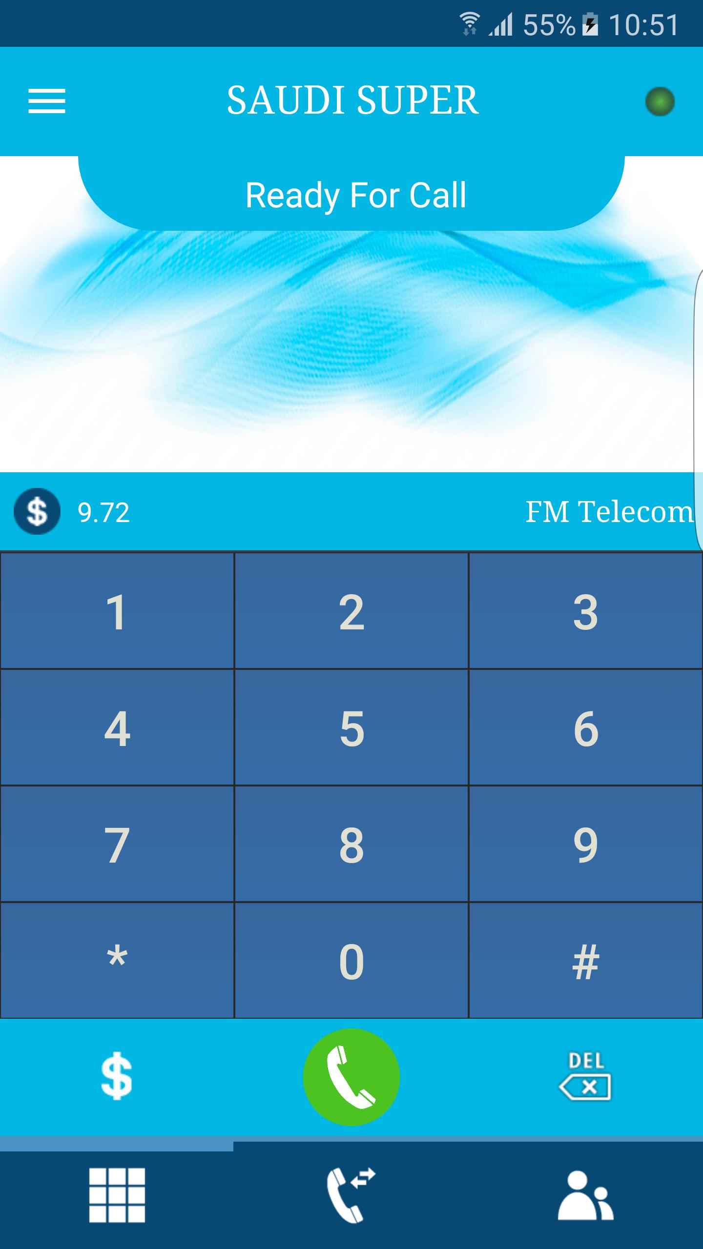 " Saudi Super "는 호환 Android 전화 세트에서 서비스 제공 업체를 사용하여 VoIP 통화를하는 데 사용할 수 있습니다. Wi -Fi 또는 3G/4G 네트워크를 통해 국제적인 음성 통화를 허용합니다. 이 응용 프로그램을 서비스로 번들로 한 서비스 제공 업체는 고객에게 Saudi Super Dialer를 다운로드 할 수 있도록 고객에게 제공 할 수 있습니다. 설치 후 사용자는 사용자 이름과 비밀번호가 필요합니다. 액세스 핀을 얻으려면 리셀러에게 문의하십시오.